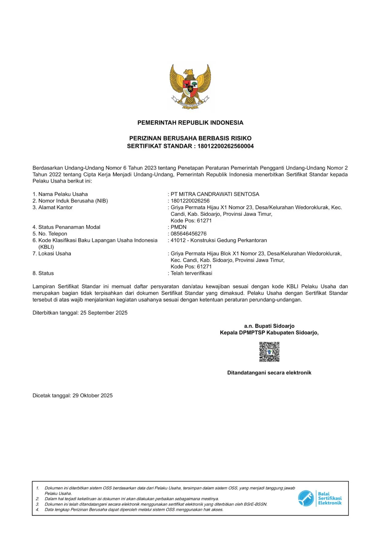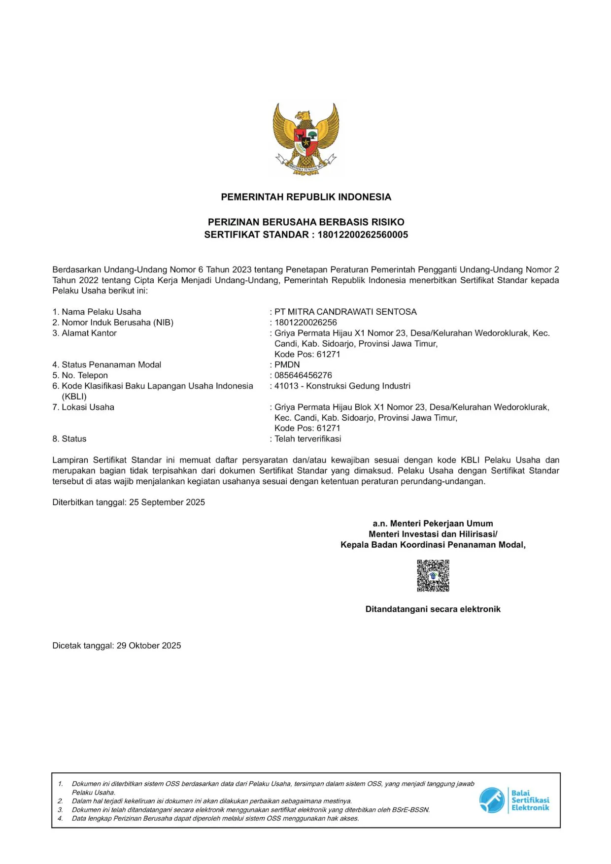 Berikut adalah dua sertifikat resmi perusahaan kami sebagai bukti kompetensi dan legalitas.